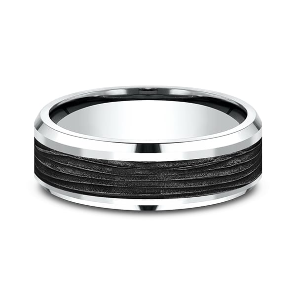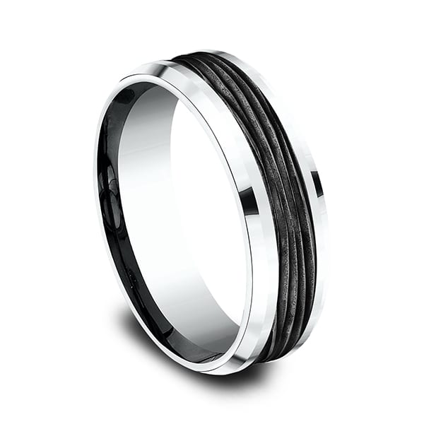 Extremely unique and distinguishing, this 7mm 14k white gold design wedding band features a horizontal bark pattern carved into the rings black titanium center. Ammara Stone wedding bands are contemporary wedding rings fusing traditional precious metals with exciting new alternative metals like black titanium and tantalum. Responsibly made in the USA, you can feel good about choosing one of our Ammara Stone wedding bands as a symbol of your commitment.