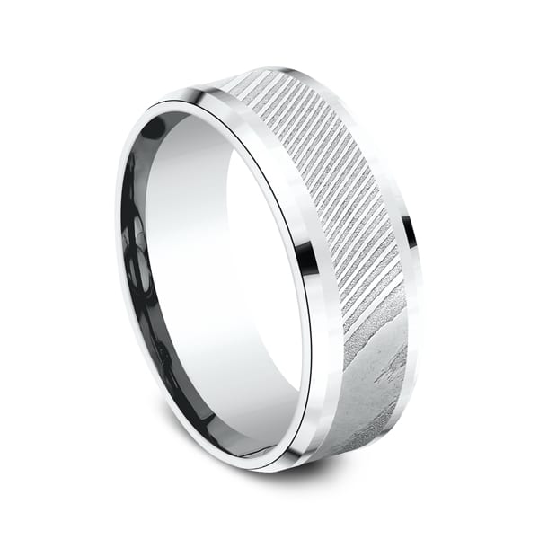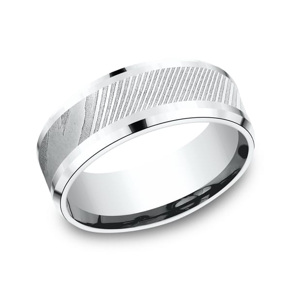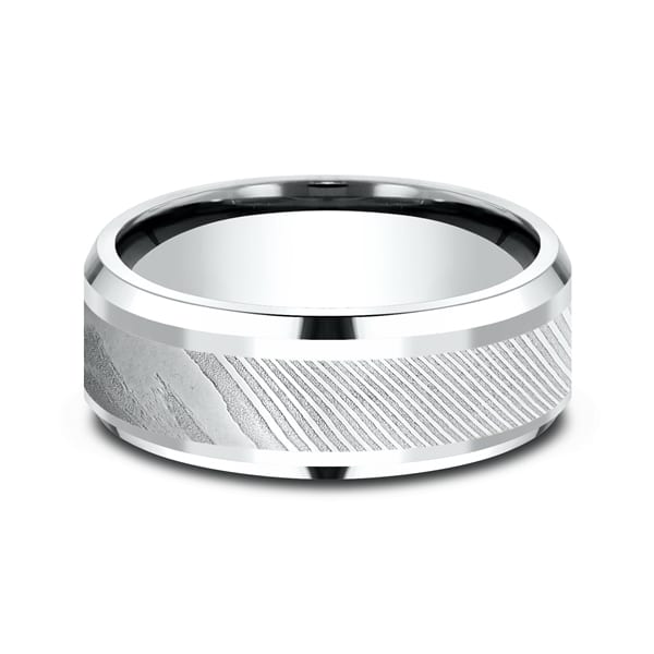 This two-part 14k White Gold wedding band features a stunning Damascus Steel center creating a unique style sure to please. Ammara Stone wedding bands are contemporary wedding rings fusing traditional precious metals with exciting new alternative metals like Black titanium and Tantalum. Responsibly made in the USA, you can feel good about choosing one of our Ammara Stone wedding bands as a symbol of your commitment.
