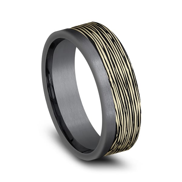 This 14k Yellow Gold 7mm comfort-fit design wedding ring features an organic bark design with blackened detail and an offset Tantalum accent for a beautiful asymmetrical look. Ammara Stone wedding bands are contemporary wedding rings fusing traditional precious metals with exciting new alternative metals like Black titanium and Tantalum. Responsibly made in the USA, you can feel good about choosing one of our Ammara Stone wedding bands as a symbol of your commitment.