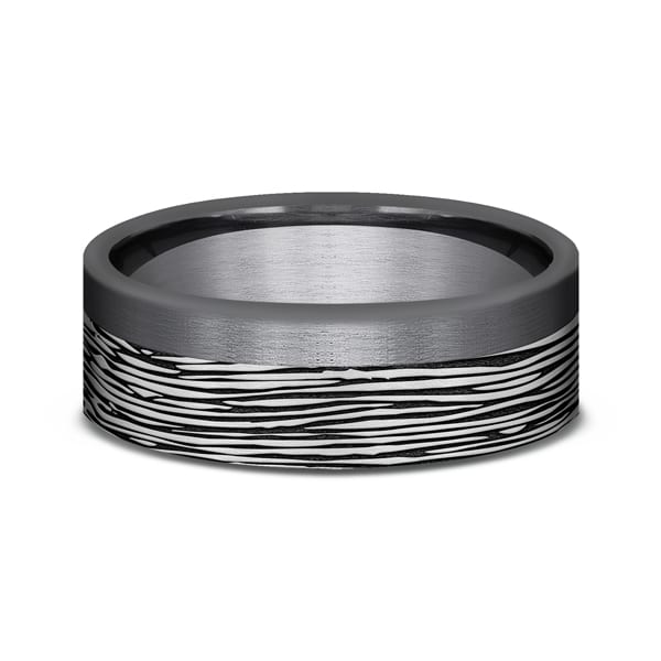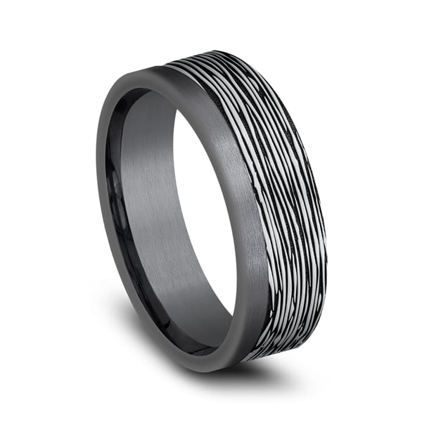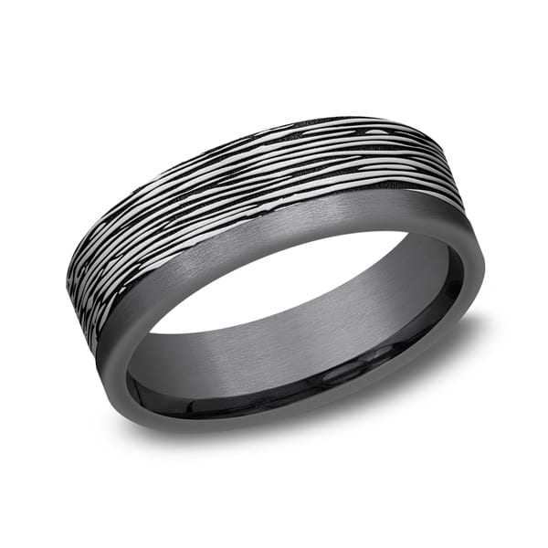 This 14k White Gold 7mm comfort-fit design wedding ring features an organic bark design with blackened detail and an offset Tantalum accent for a beautiful asymmetrical look. Ammara Stone wedding bands are contemporary wedding rings fusing traditional precious metals with exciting new alternative metals like Black titanium and Tantalum. Responsibly made in the USA, you can feel good about choosing one of our Ammara Stone wedding bands as a symbol of your commitment.