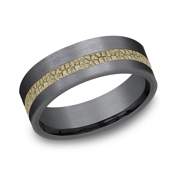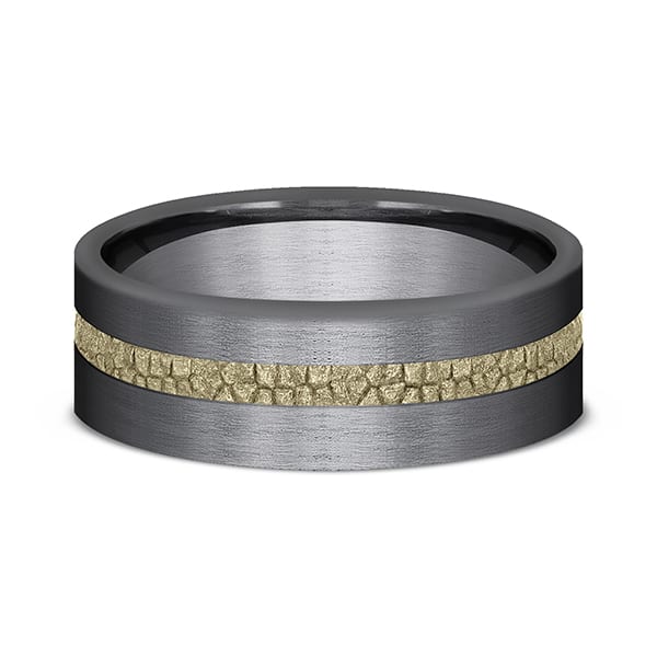 A yellow gold cobblestone band set amidst darkened tantalum creates a uniquely elegant two-tone effect. Ammara Stone wedding bands are contemporary wedding rings fusing traditional precious metals with exciting new alternative metals like black titanium and tantalum. Responsibly made in the USA, you can feel good about choosing one of our Ammara Stone wedding bands as a symbol of your commitment.