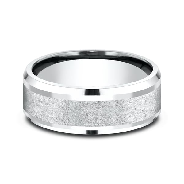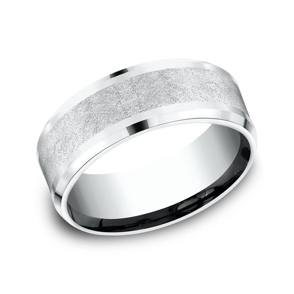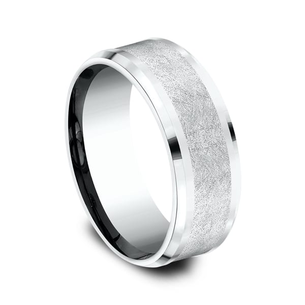 This remarkable 8mm 14k White Gold band features a stunning swirl brushed center for a very modern look. Ammara Stone wedding bands are contemporary wedding rings fusing traditional precious metals with exciting new alternative metals like Black titanium and Tantalum. Responsibly made in the USA, you can feel good about choosing one of our Ammara Stone wedding bands as a symbol of your commitment.