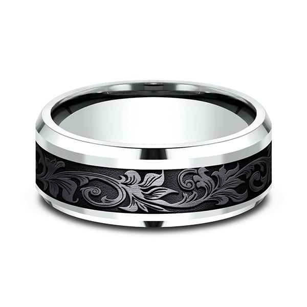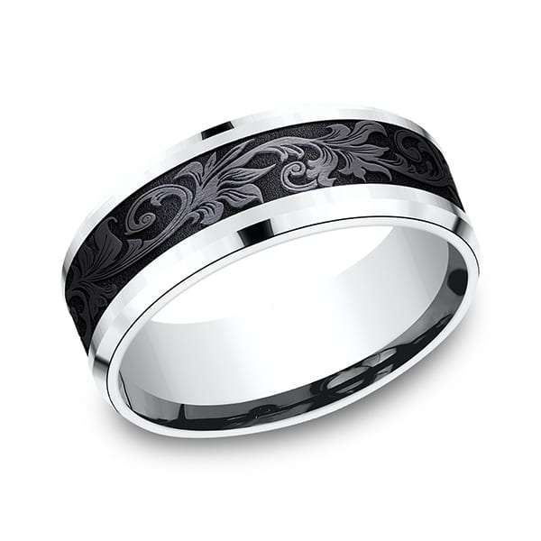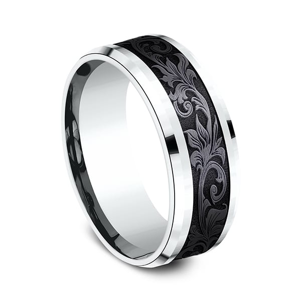 Inspired by the Victorian era, the floral motifs on this 8mm comfort-fit black titanium and 14k white gold design wedding ring creates a decidedly vintage visage. Ammara Stone wedding bands are contemporary wedding rings fusing traditional precious metals with exciting new alternative metals like black titanium and tantalum. Responsibly made in the USA, you can feel good about choosing one of our Ammara Stone wedding bands as a symbol of your commitment.