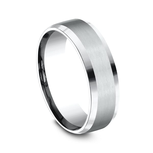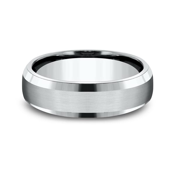 Sleek beveled edges frame a beautiful satin finish center on this 14k White Gold 6.5mm comfort-fit design wedding ring. Ammara Stone wedding bands are contemporary wedding rings fusing traditional precious metals with exciting new alternative metals like Black titanium and Tantalum. Responsibly made in the USA, you can feel good about choosing one of our Ammara Stone wedding bands as a symbol of your commitment.