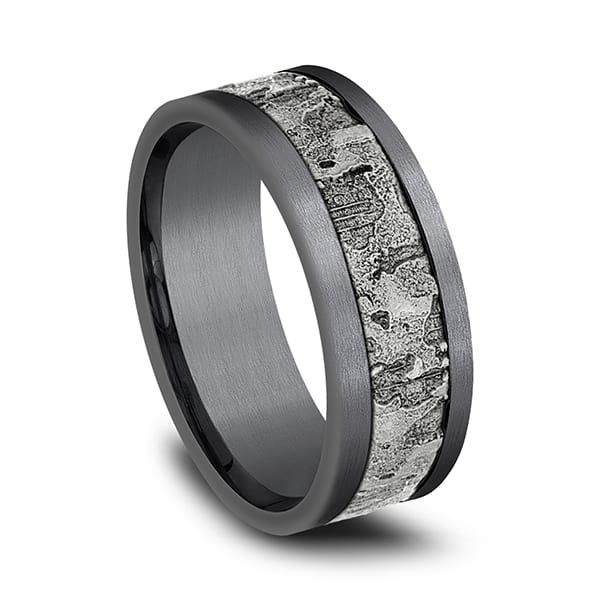 This incredible 8mm two-toned band with an intricate wall fracture center is framed beautifully by two tantalum edges. Ammara Stone wedding bands are contemporary wedding rings fusing traditional precious metals with exciting new alternative metals like black titanium and tantalum. Responsibly made in the USA, you can feel good about choosing one of our Ammara Stone wedding bands as a symbol of your commitment.