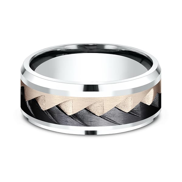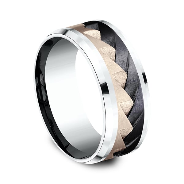 This striking 9mm comfort-fit 14 karat gold and black titanium design wedding band features a beautifully layered intersecting pattern. Ammara Stone wedding bands are contemporary wedding rings fusing traditional precious metals with exciting new alternative metals like black titanium and tantalum. Responsibly made in the USA, you can feel good about choosing one of our Ammara Stone wedding bands as a symbol of your commitment.