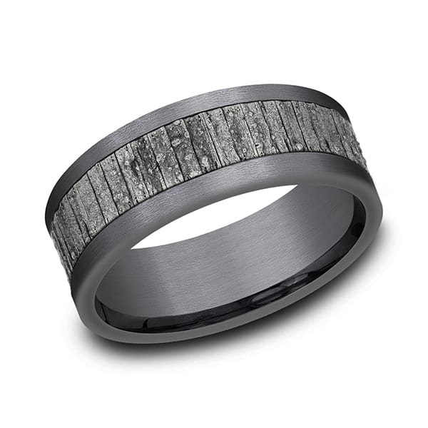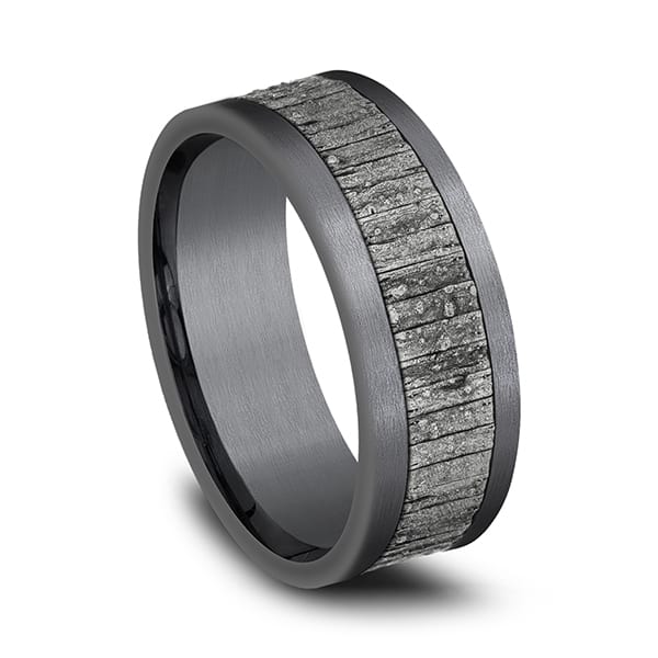 This incredible 8mm two-toned band with a detailed wood split center is flanked by two tantalum edges. Ammara Stone wedding bands are contemporary wedding rings fusing traditional precious metals with exciting new alternative metals like black titanium and tantalum. Responsibly made in the USA, you can feel good about choosing one of our Ammara Stone wedding bands as a symbol of your commitment.