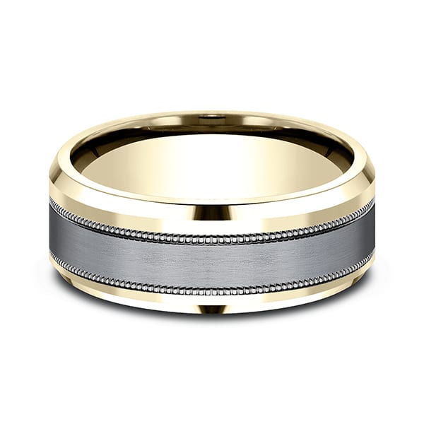 This sleek yellow gold 8mm comfort-fit design ring features a satin finish milgrain tantalum center. Ammara Stone wedding bands are contemporary wedding rings fusing traditional precious metals with exciting new alternative metals like black titanium and tantalum. Responsibly made in the USA, you can feel good about choosing one of our Ammara Stone wedding bands as a symbol of your commitment.