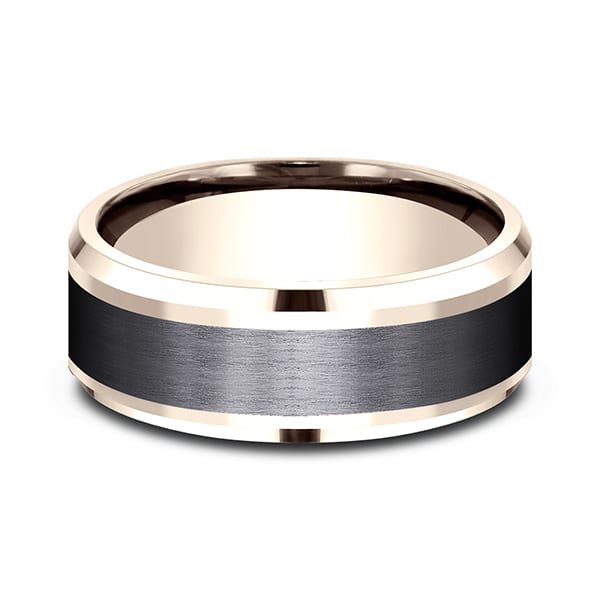 Mix contemporary sleekness and classic lines with this 8mm rose gold and black titanium design wedding band. Ammara Stone wedding bands are contemporary wedding rings fusing traditional precious metals with exciting new alternative metals like black titanium and tantalum. Responsibly made in the USA, you can feel good about choosing one of our Ammara Stone wedding bands as a symbol of your commitment.