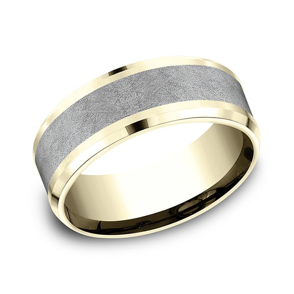 A swirl finish tantalum inlay is the highlight of this yellow gold 8mm comfort-fit design wedding band. Ammara Stone wedding bands are contemporary wedding rings fusing traditional precious metals with exciting new alternative metals like black titanium and tantalum. Responsibly made in the USA, you can feel good about choosing one of our Ammara Stone wedding bands as a symbol of your commitment.