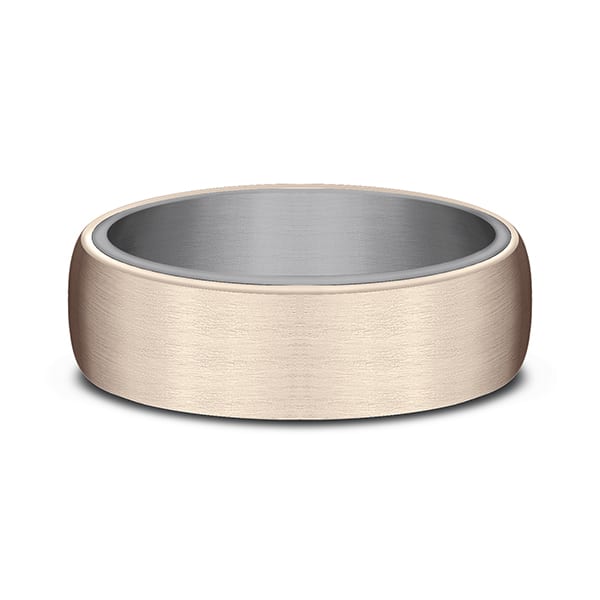 The elegant satin finish on this 6.5mm comfort-fit grey tantalum and rose gold wedding ring is highlighted by a subtle two-tone effect created by the contrasting metals. Ammara Stone wedding bands are contemporary wedding rings fusing traditional precious metals with exciting new alternative metals like black titanium and tantalum. Responsibly made in the USA, you can feel good about choosing one of our Ammara Stone wedding bands as a symbol of your commitment.