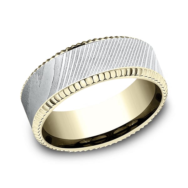 With a look that is both organic and industrial, this 8mm yellow gold design band features a stylish Damascus steel inlay. Ammara Stone wedding bands are contemporary wedding rings fusing traditional precious metals with exciting new alternative metals like black titanium and tantalum. Responsibly made in the USA, you can feel good about choosing one of our Ammara Stone wedding bands as a symbol of your commitment.