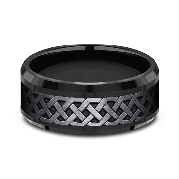 This black titanium 9mm comfort-fit design wedding ring showcases the iconic Celtic knot design. Forge by Benchmark offers contemporary wedding rings in cobalt, titanium, Damascus Steel and tungsten. Some of our most durable and rugged wedding bands for men, our Forge line of wedding rings are sure to last a lifetime.