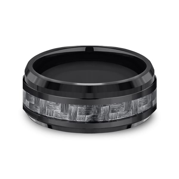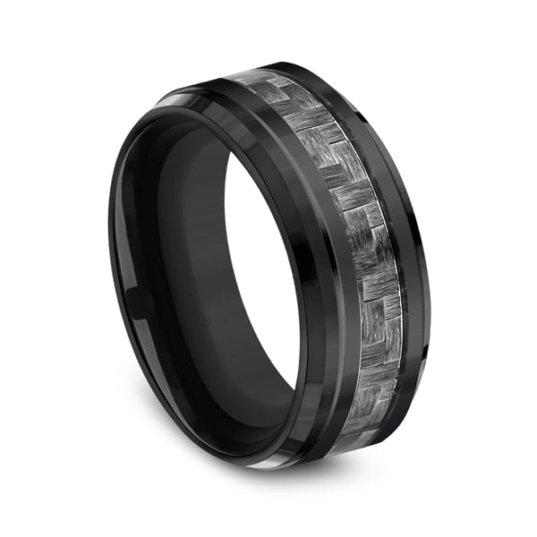 This unique 9mm comfort-fit Black titanium wedding band features a carbon fiber center inlay with high polished beveled round edges that is both sleek and subtle. Forge by Benchmark offers contemporary wedding rings in cobalt, titanium, Damascus Steel and tungsten. Some of our most durable and rugged wedding bands for men, our Forge line of wedding rings are sure to last a lifetime.