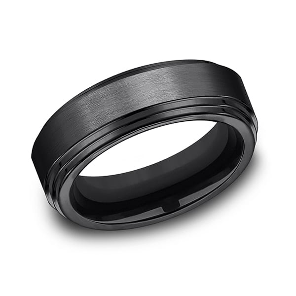 This unique black titanium 8mm comfort-fit wedding band features a satin finish center and a high polished double edge. Forge by Benchmark offers contemporary wedding rings in cobalt, titanium, Damascus Steel and tungsten. Some of our most durable and rugged wedding bands for men, our Forge line of wedding rings are sure to last a lifetime.