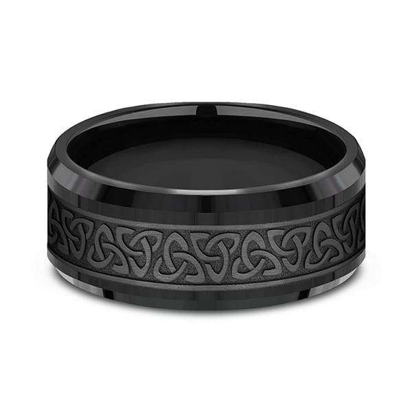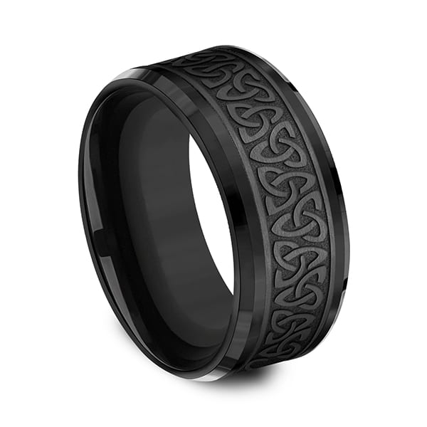 This black titanium 9mm comfort-fit design. Forge by Benchmark offers contemporary wedding rings in cobalt, titanium, Damascus Steel and tungsten. Some of our most durable and rugged wedding bands for men, our Forge line of wedding rings are sure to last a lifetime. ring features the iconic Celtic knot design. Forge by Benchmark offers contemporary wedding rings in cobalt, titanium, Damascus Steel and tungsten. Some of our most durable and rugged wedding bands for men, our Forge line of wedding rings are sure to last a lifetime.
