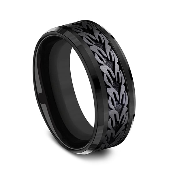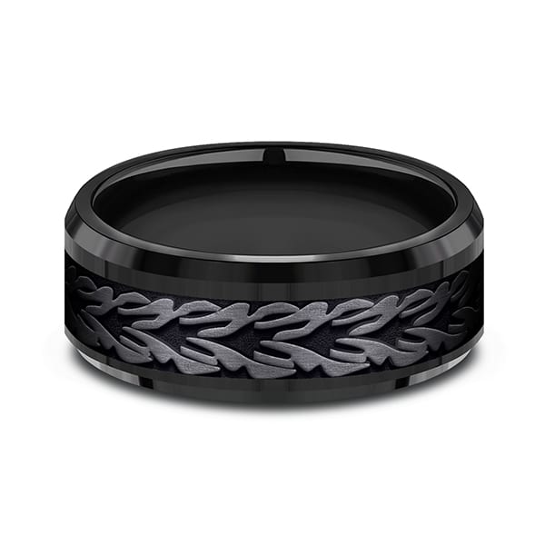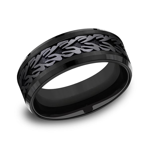 An homage to nature's beauty, this 8mm black titanium design wedding band features a deconstructed leaf design framed by drop beveled edges. Forge by Benchmark offers contemporary wedding rings in cobalt, titanium, Damascus Steel and tungsten. Some of our most durable and rugged wedding bands for men, our Forge line of wedding rings are sure to last a lifetime.