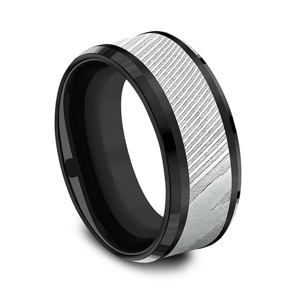 A stunning marriage of metals, this 9mm design wedding band features a Damascus Steel center cradled in a black titanium embrace. Forge by Benchmark offers contemporary wedding rings in cobalt, titanium, Damascus Steel and tungsten. Some of our most durable and rugged wedding bands for men, our Forge line of wedding rings are sure to last a lifetime.