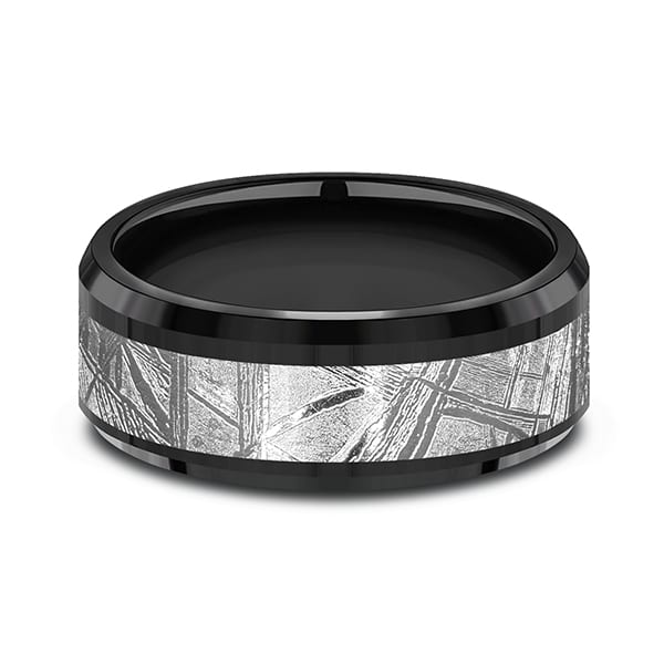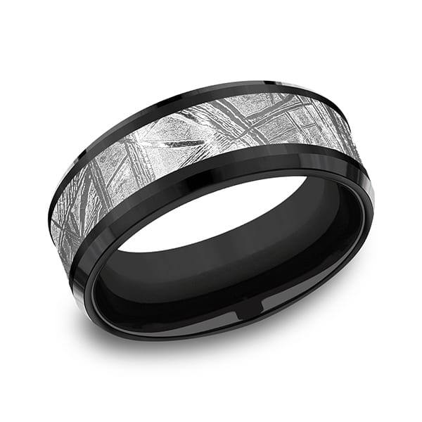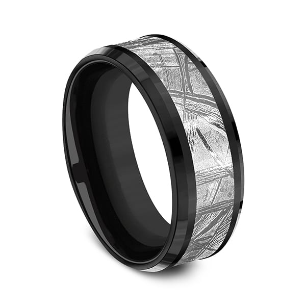 This striking 8mm comfort-fit black titanium wedding ring cradles a Meteorite inlay. Forge by Benchmark offers contemporary wedding rings in cobalt, titanium, Damascus Steel and tungsten. Some of our most durable and rugged wedding bands for men, our Forge line of wedding rings are sure to last a lifetime.