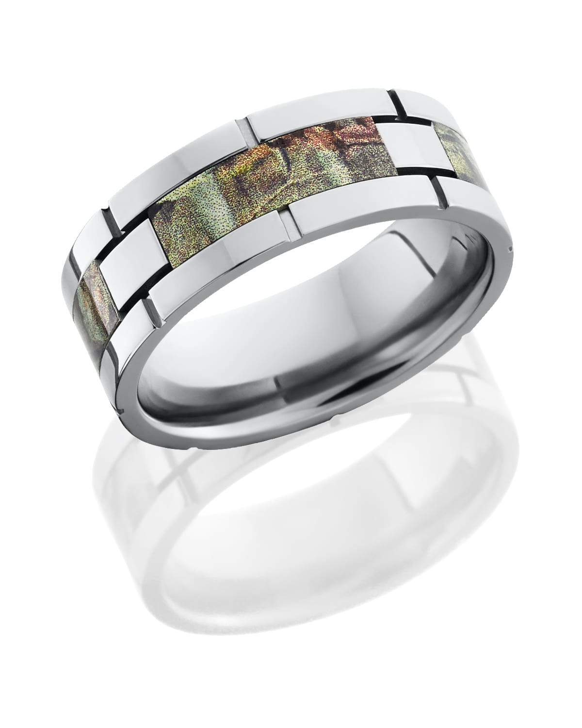 Titanium 8mm flat band with four segments of the Real Tree AP pattern