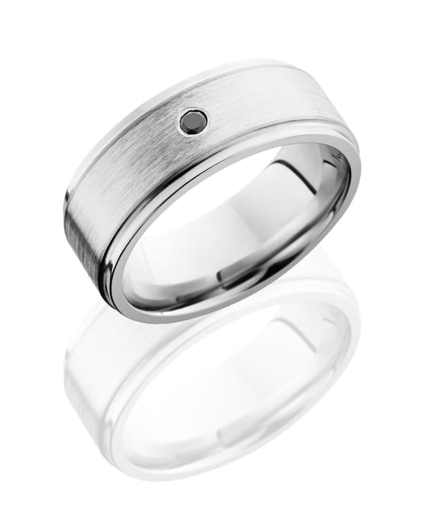 Cobalt Chrome 8mm Flat Band with Grooved Edges, 5mm SS, and Flush Set .03ct Black Round Diamond