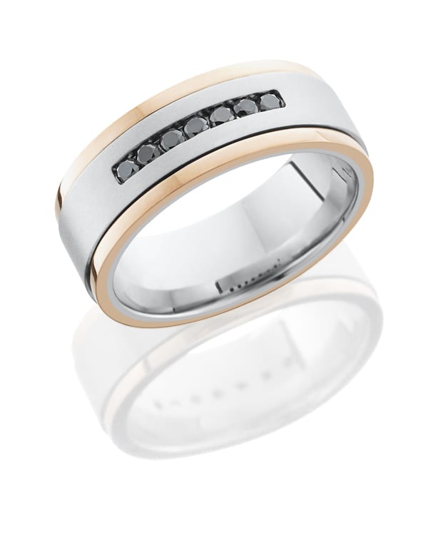 Cobalt Chrome 8mm flat band with 14KR grooved edges with seven channel set .04ct black diamonds