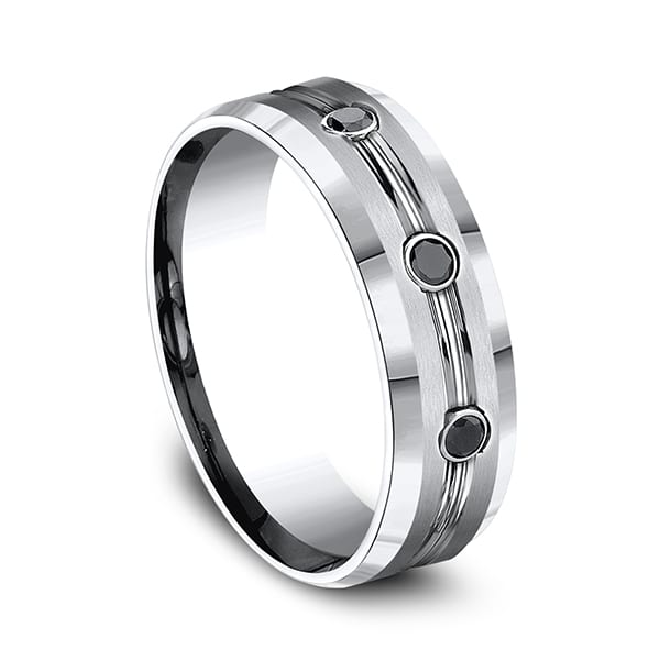 This incredible cobalt 7.5 mm comfort-fit satin edge band features a high polished center between three round ideal-cut black diamonds. Approximate total diamond carat weight is .20ct. Forge by Benchmark offers contemporary wedding rings in cobalt, titanium, Damascus Steel and tungsten. Some of our most durable and rugged wedding bands for men, our Forge line of wedding rings are sure to last a lifetime.