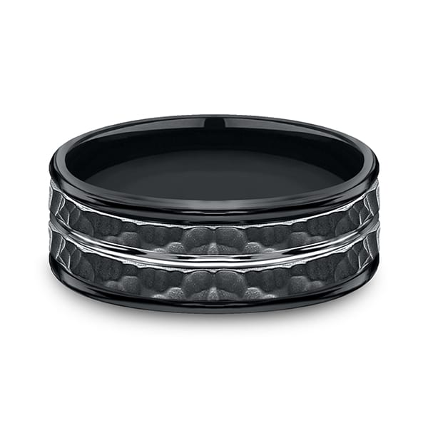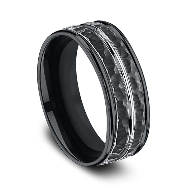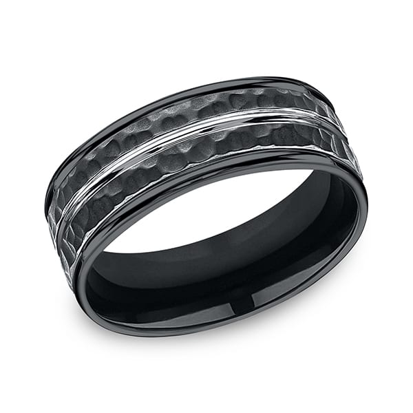This black cobalt comfort-fit ring truly makes a statement with a hammer finish and a high polish White center cut. Forge by Benchmark offers contemporary wedding rings in cobalt, titanium, Damascus Steel and tungsten. Some of our most durable and rugged wedding bands for men, our Forge line of wedding rings are sure to last a lifetime.