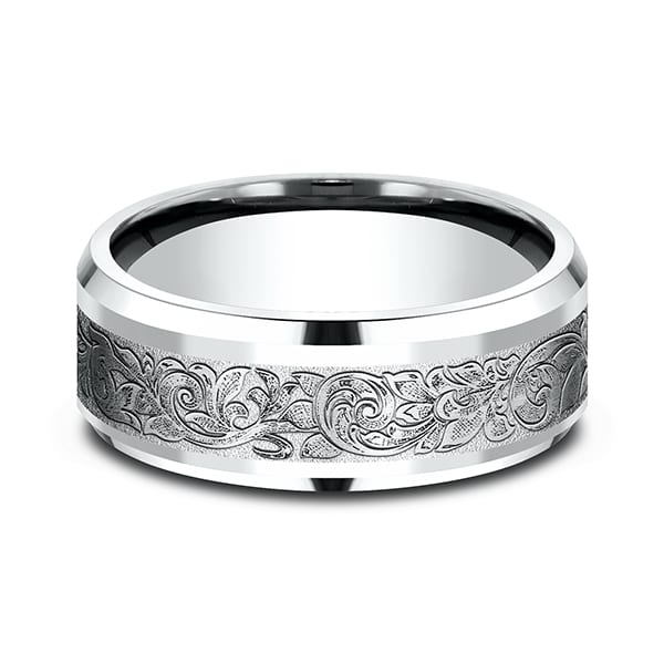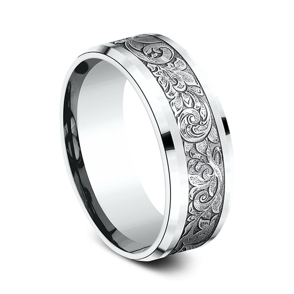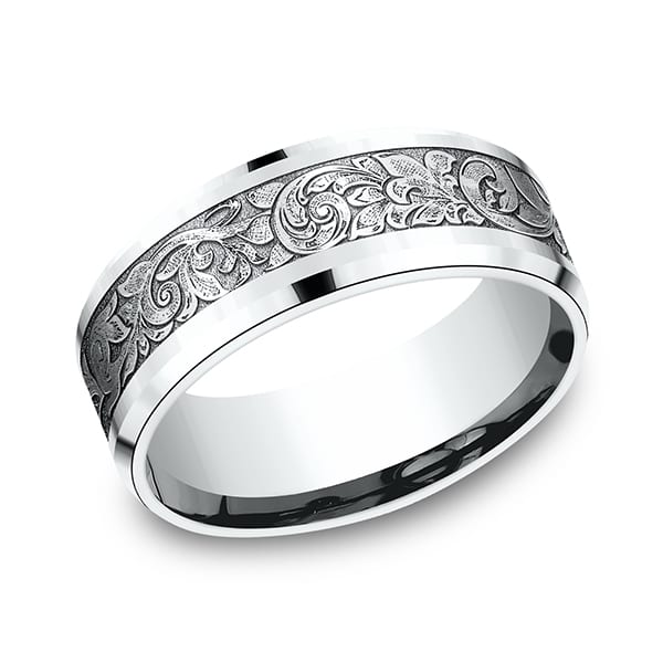 The floral script on this 8mm comfort-fit design ring channels the vintage feel of the Victorian era. Benchmark has been manufacturing designer wedding rings in gold platinum and palladium for over 40 years. Made in the USA using 100% recycled materials you can feel good about choosing Benchmark wedding bands.