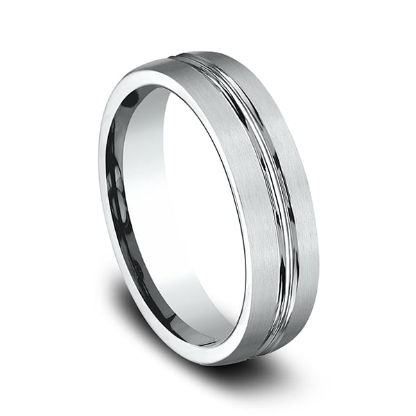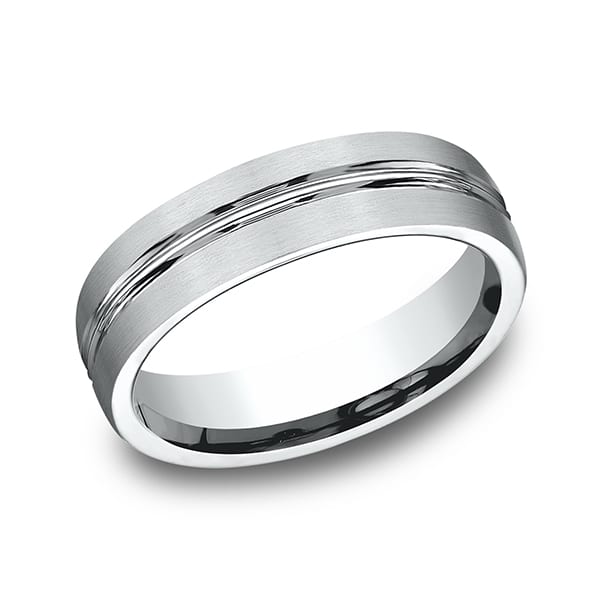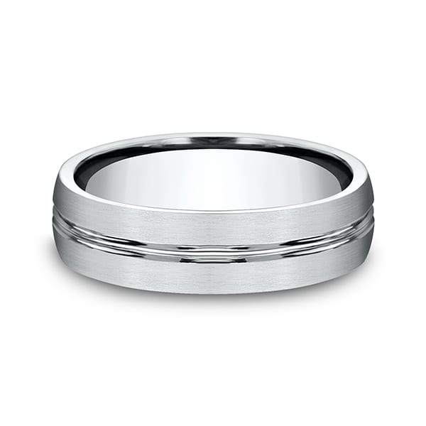 This 14 karat white gold 6mm comfort-fit satin finish carved wedding band features a high polished cut along the center. Benchmark has been manufacturing designer wedding rings in gold platinum and palladium for over 40 years. Made in the USA using 100% recycled materials you can feel good about choosing Benchmark wedding bands.