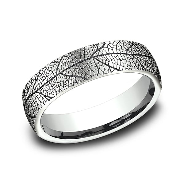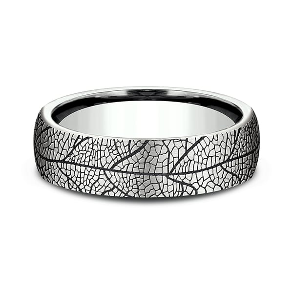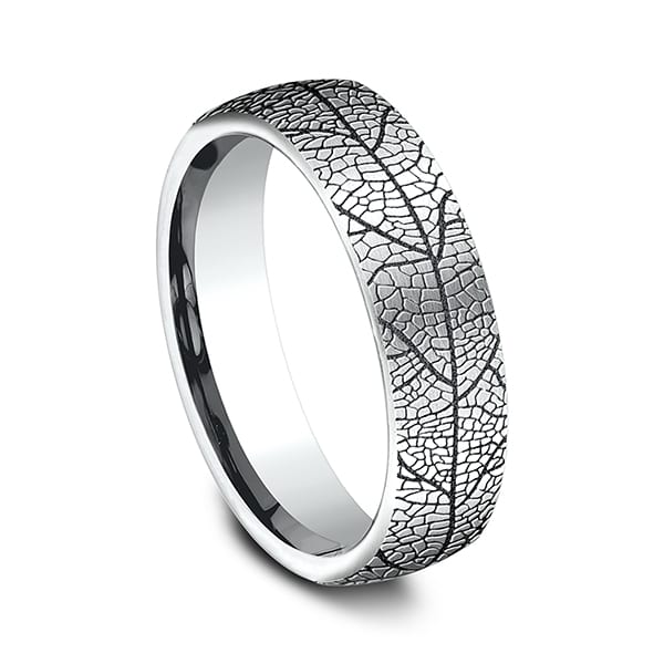 Inspired by nature the beautifully organic leaf pattern on this 6.5mm comfort-fit ring is created using a wear resistant black coating. Benchmark has been manufacturing designer wedding rings in gold platinum and palladium for over 40 years. Made in the USA using 100% recycled materials you can feel good about choosing Benchmark wedding bands.