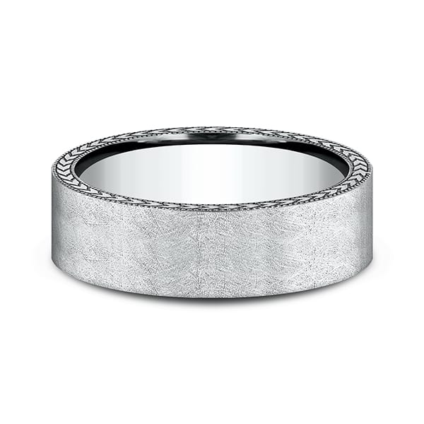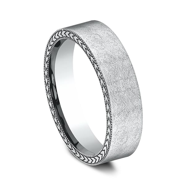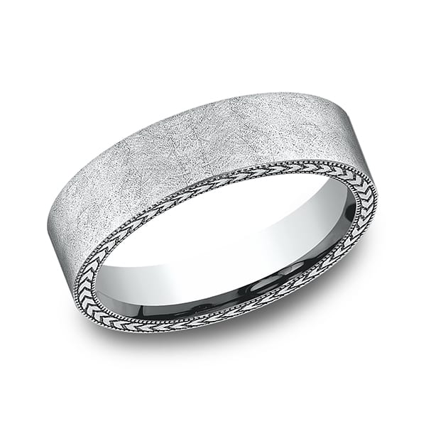 Our signature swirl finish is embraced by a wheat milgrain edging on this 6.5mm comfort-fit ring. Benchmark has been manufacturing designer wedding rings in gold platinum and palladium for over 40 years. Made in the USA using 100% recycled materials you can feel good about choosing Benchmark wedding bands.
