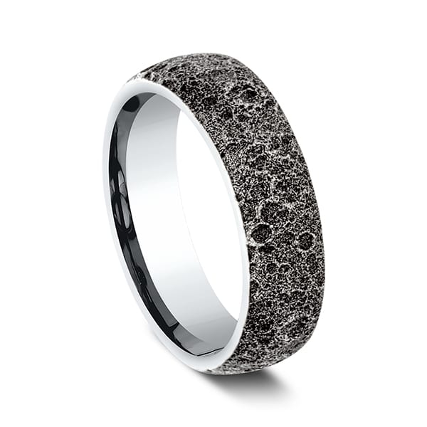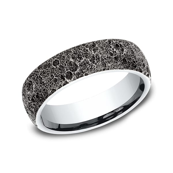 The wear resistant black detailing on this 6mm gold ring creates a beautiful out of this world moon rock design. Benchmark has been manufacturing designer wedding rings in gold platinum and palladium for over 40 years. Made in the USA using 100% recycled materials you can feel good about choosing Benchmark wedding bands.