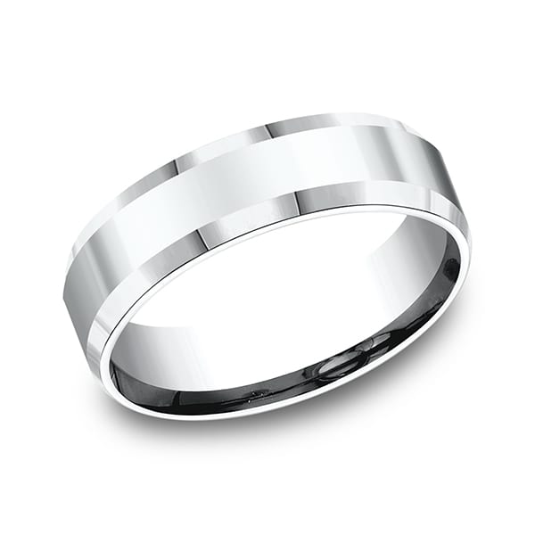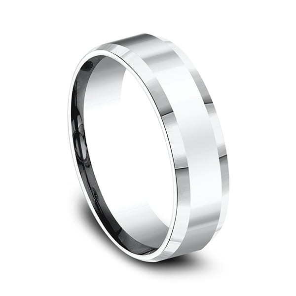 This stylish 14 karat white gold 6mm comfort-fit high polished carved wedding band features a slight beveled edge for a classic look. Benchmark has been manufacturing designer wedding rings in gold platinum and palladium for over 40 years. Made in the USA using 100% recycled materials you can feel good about choosing Benchmark wedding bands.