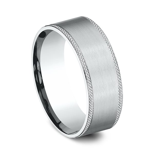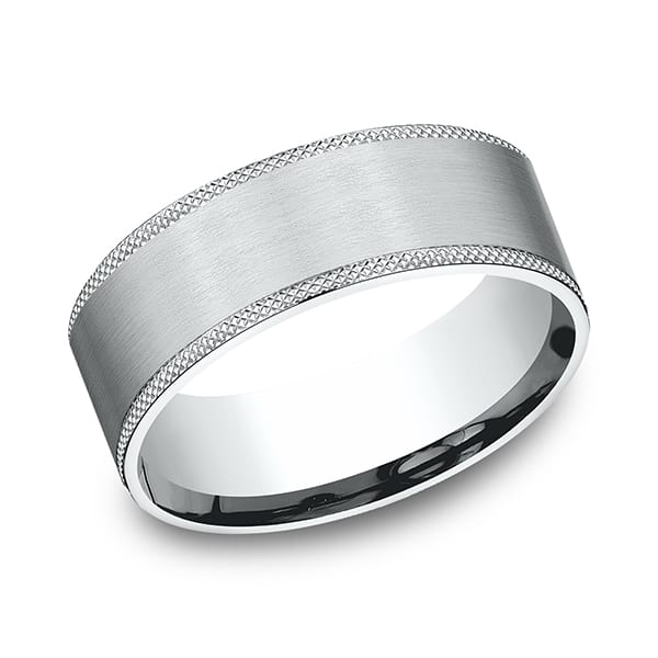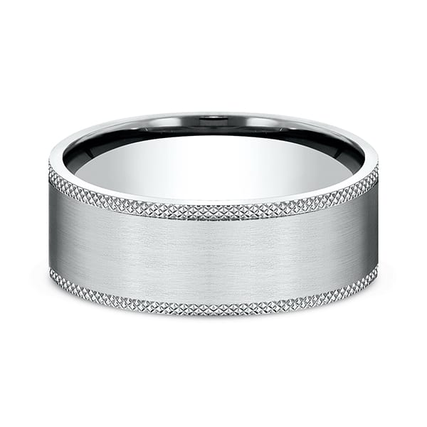 This 8mm comfort-fit band features a stunning knurled edge and satin center. Benchmark has been manufacturing designer wedding rings in gold platinum and palladium for over 40 years. Made in the USA using 100% recycled materials you can feel good about choosing Benchmark wedding bands.