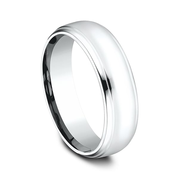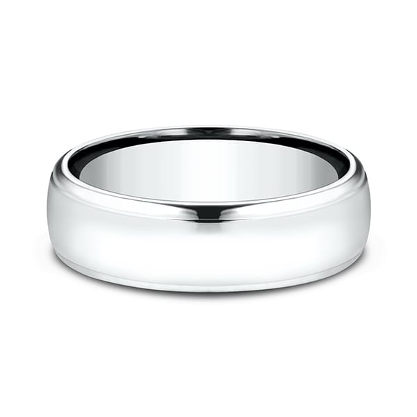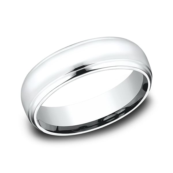 This elegantly simple 14 karat white gold 6.5mm comfort-fit carved wedding band features a drop edge and high polish finish. Benchmark has been manufacturing designer wedding rings in gold platinum and palladium for over 40 years. Made in the USA using 100% recycled materials you can feel good about choosing Benchmark wedding bands.