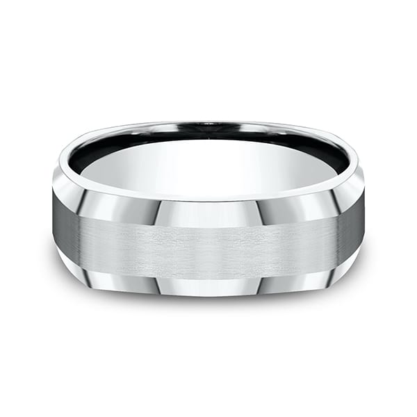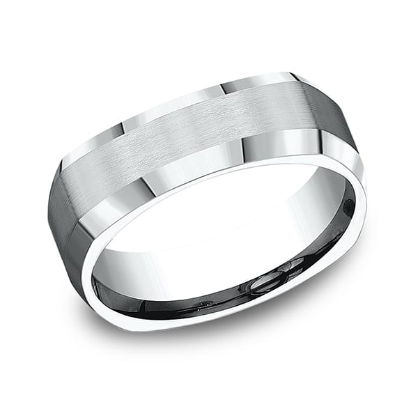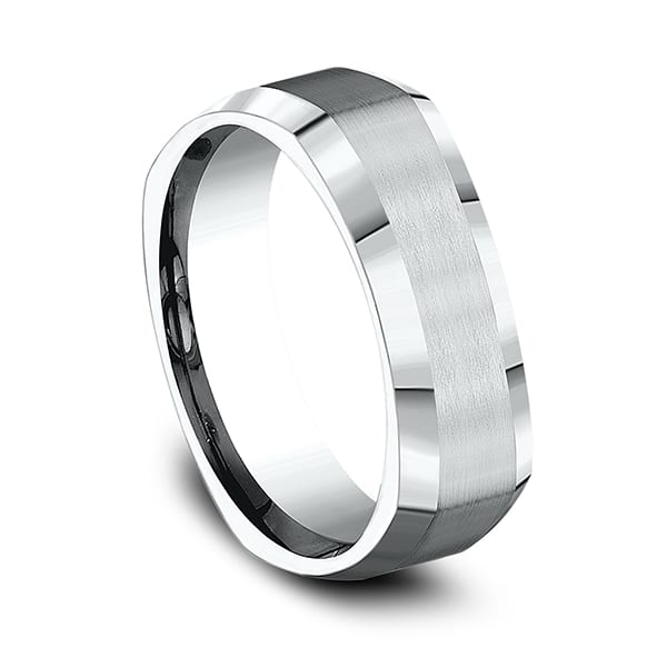 This incredible 14 karat white gold 7mm comfort-fit four-sided band features a satin finish center and a high polished beveled edge. Benchmark has been manufacturing designer wedding rings in gold platinum and palladium for over 40 years. Made in the USA using 100% recycled materials you can feel good about choosing Benchmark wedding bands.