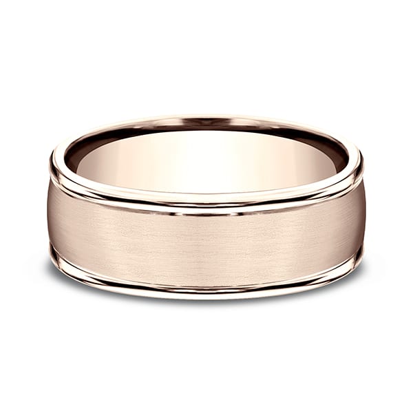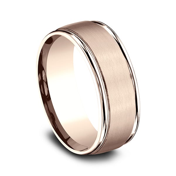 This 14 karat rose gold 8mm comfort-fit carved wedding band features a satin finish with a high polished round edge for noticeable style. Benchmark has been manufacturing designer wedding rings in gold platinum and palladium for over 40 years. Made in the USA using 100% recycled materials you can feel good about choosing Benchmark wedding bands.