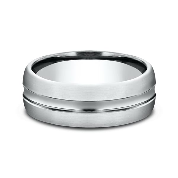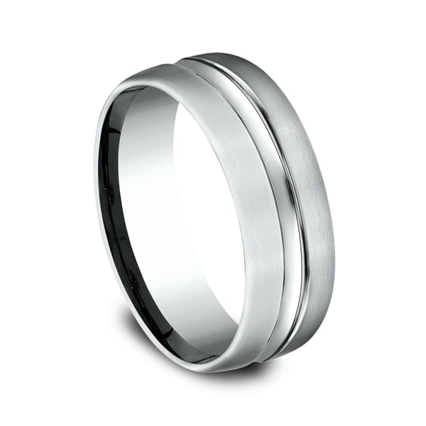 This 7.5mm comfort-fit 14 karat white gold carved wedding band features a satin finish and high polished center cut for a rugged and stylish look. Benchmark has been manufacturing designer wedding rings in gold platinum and palladium for over 40 years. Made in the USA using 100% recycled materials you can feel good about choosing Benchmark wedding bands.