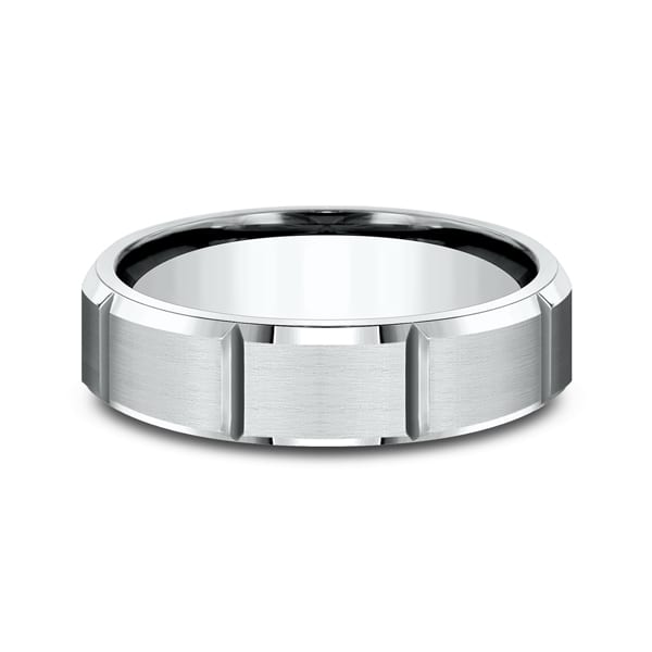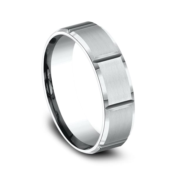 This 6mm 14 karat white gold comfort-fit satin finish carved wedding band features strong vertical grooves along the center for a refined industrial look. Benchmark has been manufacturing designer wedding rings in gold platinum and palladium for over 40 years. Made in the USA using 100% recycled materials you can feel good about choosing Benchmark wedding bands.