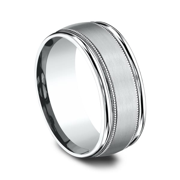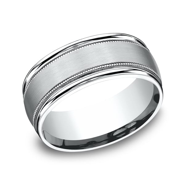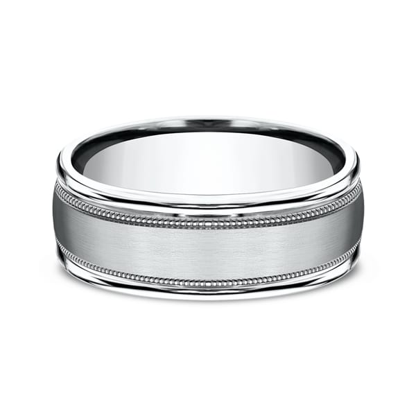 This beautiful 8mm 14 karat white gold comfort-fit carved wedding band features a satin finish center with milgrain and a round edge. Benchmark has been manufacturing designer wedding rings in gold platinum and palladium for over 40 years. Made in the USA using 100% recycled materials you can feel good about choosing Benchmark wedding bands.