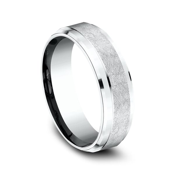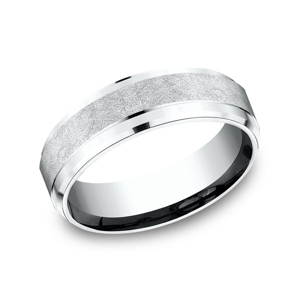 This classically beautiful 14 karat white gold 7mm comfort-fit carved wedding band features a drop bevel and swirl finish center. Benchmark has been manufacturing designer wedding rings in gold platinum and palladium for over 40 years. Made in the USA using 100% recycled materials you can feel good about choosing Benchmark wedding bands.