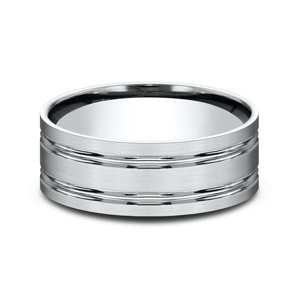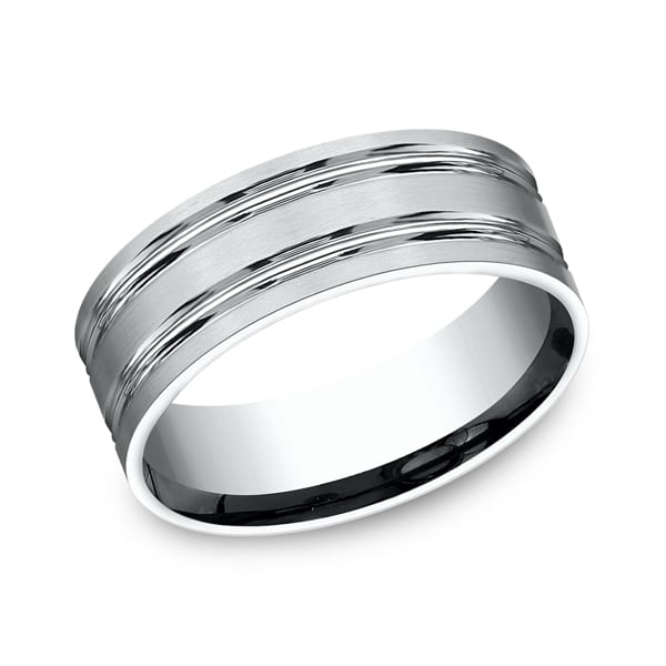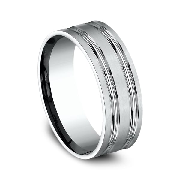 This incredible 8mm 14 karat white gold comfort-fit satin finish carved wedding band features two high polished parallel center grooves for a continuous flow of style. Benchmark has been manufacturing designer wedding rings in gold platinum and palladium for over 40 years. Made in the USA using 100% recycled materials you can feel good about choosing Benchmark wedding bands.