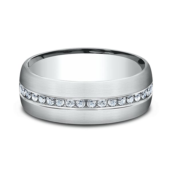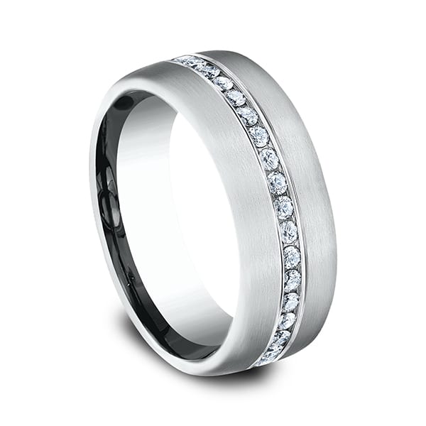 This unique 7.5mm 14 karat white gold satin finish pave set diamond wedding band features round ideal cut diamonds. Total approximate carat weight is .4ct. Benchmark has been manufacturing designer wedding rings in gold platinum and palladium for over 40 years. Made in the USA using 100% recycled materials you can feel good about choosing Benchmark wedding bands.