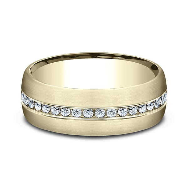 This unique 7.5mm 14 karat yellow gold satin finish pave set diamond wedding band features round ideal cut diamonds. Total approximate carat weight is .4ct. Benchmark has been manufacturing designer wedding rings in gold platinum and palladium for over 40 years. Made in the USA using 100% recycled materials you can feel good about choosing Benchmark wedding bands.