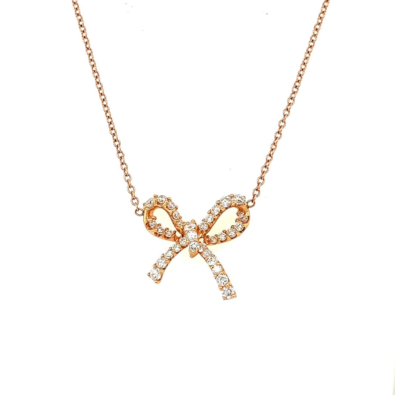14k rose gold diamond bow necklace containing 33 round diamonds