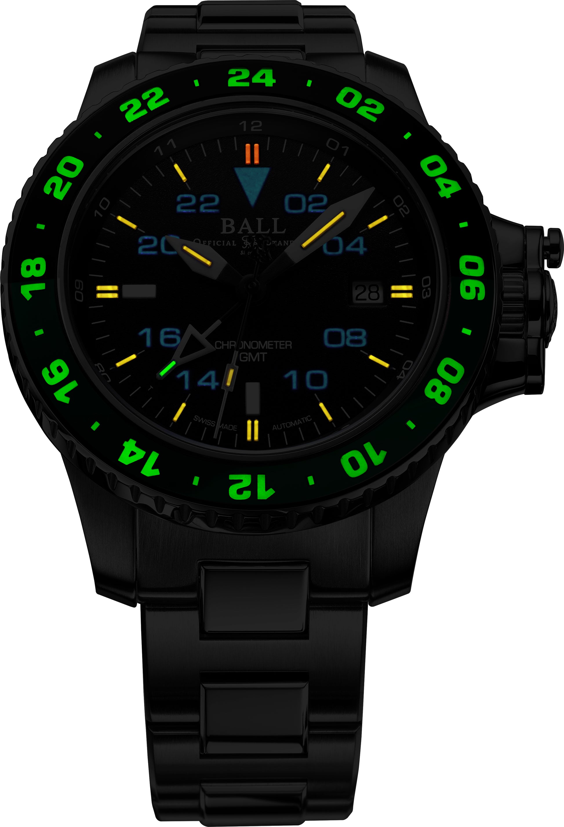 engineer hydrocarbon aero gmt ii automatic watch with black and green luminous sapphire bidirectional rotating bezel with micro gas tubes, 42mm, 100m, date, stainless steel bracelet and patented folding buckle and black dial