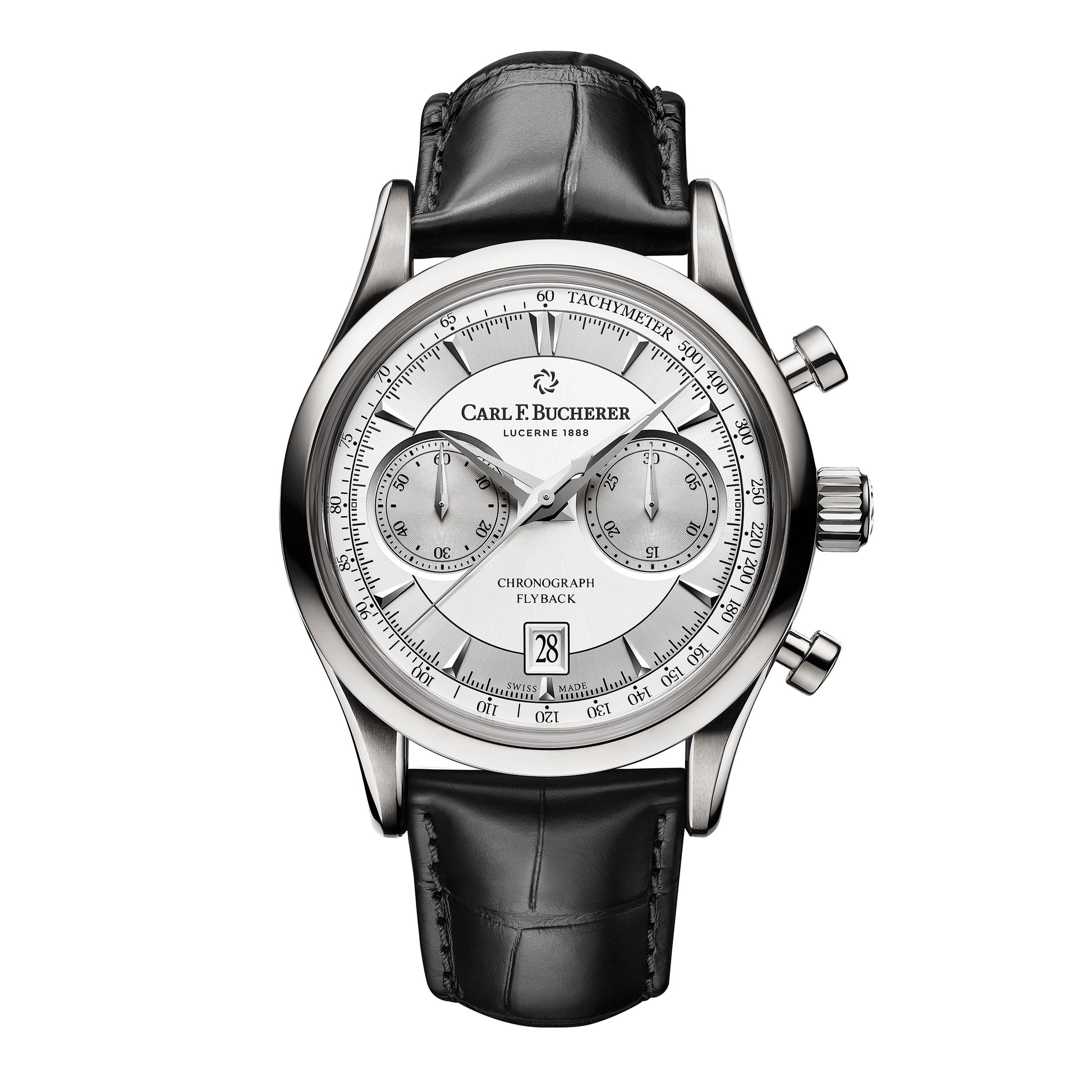 42mm stainless steel double domed sapphire crystal with anti reflective coating on both sides, case back with sapphire crystal, water resistance to 30m, power reserve 42 hours, chronograph, flyback, Louisiana alligator leather strap, stainless steel pink lock folding clasp