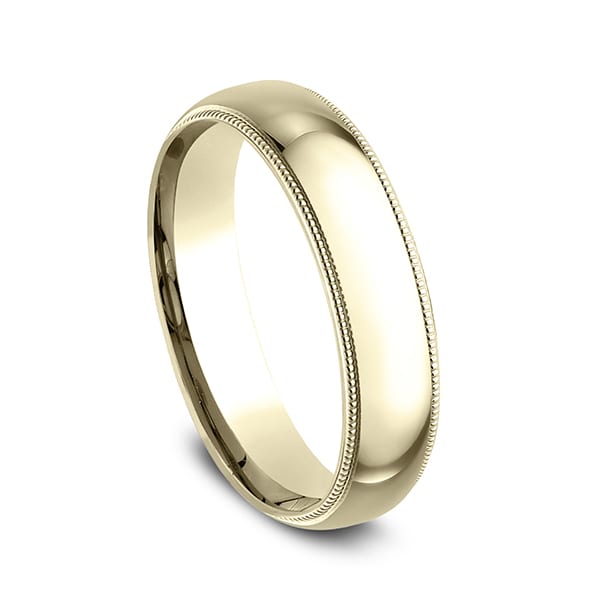 This beautiful 14 karat yellow gold 5mm wedding band features a slightly domed surface with milgrain and comfort-fit on the inside for unforgettable comfort. Benchmark has been manufacturing designer wedding rings in gold platinum and palladium for over 40 years. Made in the USA using 100% recycled materials you can feel good about choosing Benchmark wedding bands.