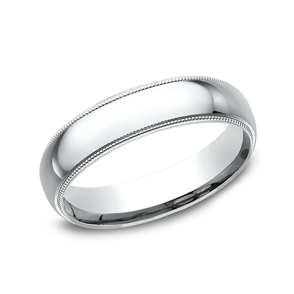 This beautiful platinum 5mm wedding band features a slightly domed surface with milgrain and comfort-fit on the inside for unforgettable comfort. Benchmark has been manufacturing designer wedding rings in gold platinum and palladium for over 40 years. Made in the USA using 100% recycled materials you can feel good about choosing Benchmark wedding bands.